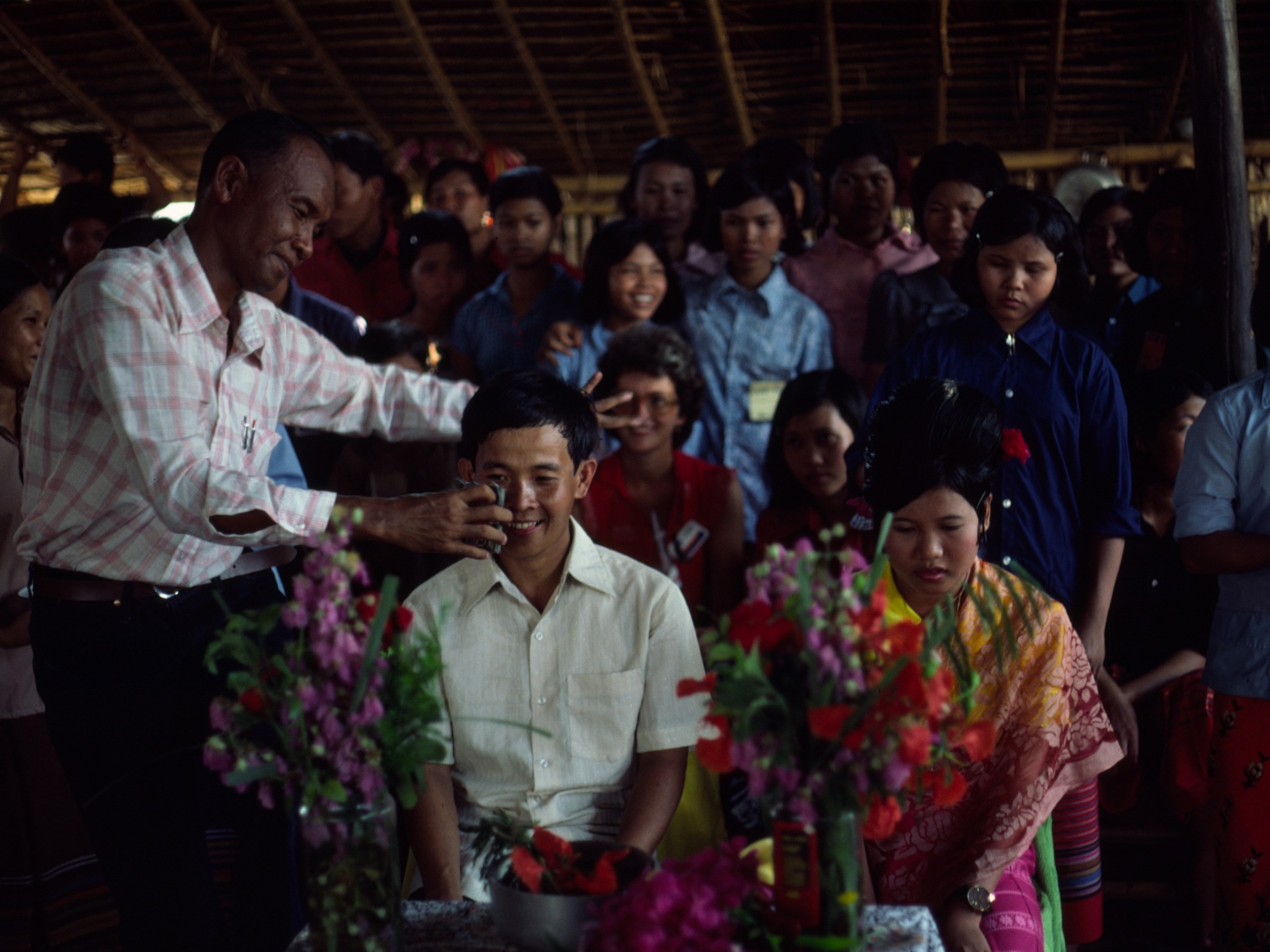 Puis le chef du village s’agenouille face à Tang et Maï et entoure le poignet du marié d’une courte ficelle qu’il noue consciencieusement. Ensuite, les autres invités, par ordre decrescendo d’importance, viennent en faire autant. Il y a bientôt des douzaines de fils autour du poignet, et aussi quelques cadeaux de mariage entassés devant les écuelles emplies de nourriture, destinée à rassasier les esprits des ancêtres. Pour les mariés, les cadeaux sont plutôt maigres, quelques paquets de cigarettes, quelques mètres de tissu acheté chez le marchand thaï qui, en pleine jungle, est venu installer un petit stand juste à la limite des barbelés. Un attirail de couture, trois fleurs, un marteau. Voilà la dot de Tang et Maï. Ils ont vingt-six et dix-neuf ans. Maï aura sans doute bientôt un premier enfant. En tous cas le rite fait tout pour ça puisque, pendant que les musiciens mettent du coeur à l’ouvrage, les mariés sont poussés dans un petit réduit sombre, où s’infiltre seulement la lumière passant entre les bambous disjoints. Sur la natte, les cris de l’assistance les encouragent vivement à consommer leur hymen. Des gamins, reluquant par les interstices, s’assurent de la bonne volonté des époux.